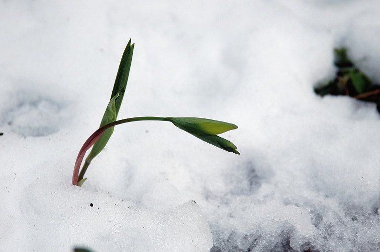 「私たち、雪や霜が無くなるころだから芽を出したのよね。なのにこの雪は何よ!」 その寒さにお怒りの御様子。4月17日に雪が降った珍しい年です。 おそらく、チゴユリやホウチャクソウのような春の小さなユリの仲間のものと思いますが種を特定できません。
