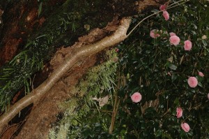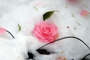 これは野の花ではありません。ちょっと間借りさせてください。 ピンクの椿の花が雪に落ち、雪の白と椿のピンクがなんとも言えないコントレストを見せてくれました。 これがその親です。