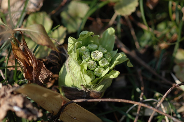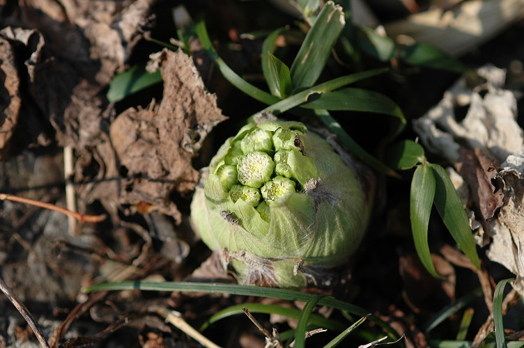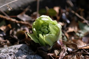よそのお家の広い庭先に咲いていたのをことわって写させてもらいました。やっと花芽が顔を出した所で、一番の食べごろです。かわいそうだけど、どうしても食べものに見えてしまいます。