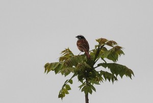 油断なくあたりを警戒しながら、縄張りを守るホオジロの雄。なかなか精悍な顔つきです。