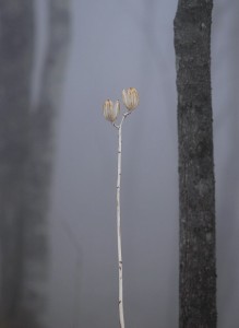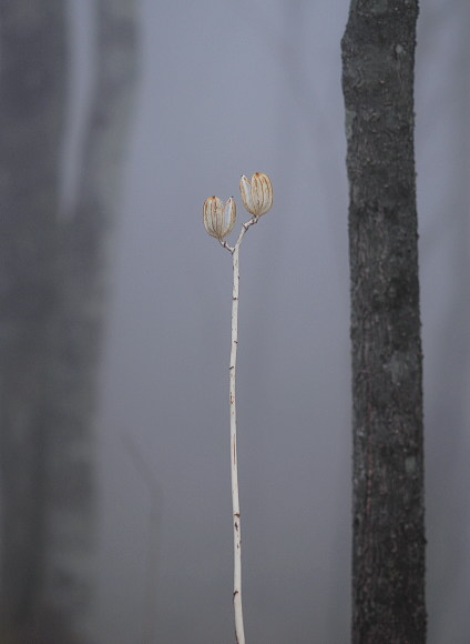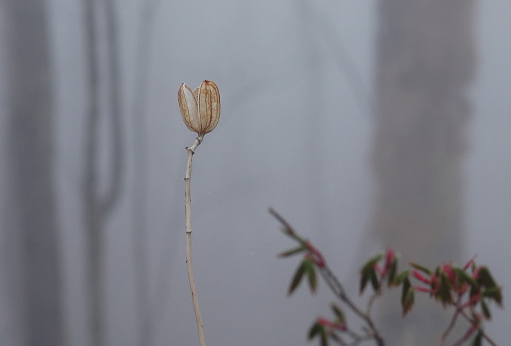 昨年のウバユリの実の抜け殻です。 霧の中で、ある種透明感のある造形を見せてくれました。