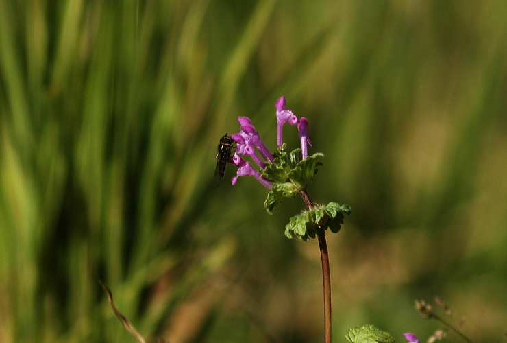 秋も終わり、他の植物が枯れて邪魔ものがいなくなりと、ホトケノザは咲き始めますね。春ほど群生はしませんが、結構見かけます。そんなホトケノザにハナアブがとまりました。