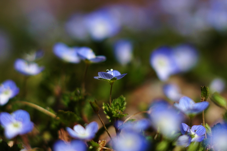 オオイヌノフグリを望遠で撮ってみました。ボケた回りの花も同じくらいの大きさに見えます。