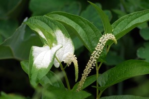 このハンゲショウはは野生のものではなく、植栽物です。でもあまり見かけない植物で、しかも面白いものですのでここに載せておきます。 ハンゲショウは野生のものもありますが、近年かなり少なくなっているという事です。 ハンゲショウは「半化粧」ではなく、夏至から11日目頃の「半夏生」の日あたりに見頃になるのでそう呼ぶのだそうです。しかし、私としては「半化粧」の方が判りやすくていいと思いますね。