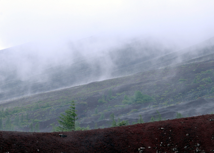 富士山五合目付近の風景です。 森の部分もありますが、このように荒涼とした部分もあります。 そこに霧(雲)が流れると、幻想的です。